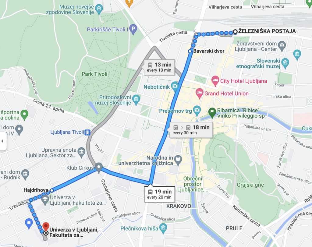 Accommodation is organized in Hostel Tabor located in an attractive downtown location. The hostel is within walking distance of the main train station. To reach the Faculty of Mathematics and Physics, we recommend you take a short walk to the bus stop “Ajdovščina” and then take either bus No. 1 to the bus stop “Jadranska” or buses No. 6 or 6B to the bus stop “Hajdrihova”. From there, take a 3-minute walk to the Faculty of Mathematics and Physics.